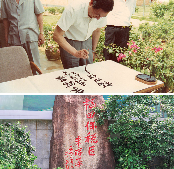 深圳是国内最早开始探索保税政策的城市,福田保税区则是深圳最早建成并投入使用的保税区。原国务院总理朱镕基分别于1992年和1997年两次莅临福田保税区考察,一向主张只签名不题词的朱镕基总理原本并不打算为保税区题词,但在在他签写自己的名字后,一旁的观众掌声雷动,经久不息,总理着实是性情中人,为此破例下笔题写了“福田保税区”五个大字。当时总理乐呵呵地开玩笑道:“这个字的版权是我的,很值钱的。”当时在观众席中的必一运动老员工每次向别人解释总理题词原稿中名字在右,而“福田保税区”在左的原因时,总是带着骄傲的语气。总理体“福田保税区”至今沿用于保税区内各标志性景观。