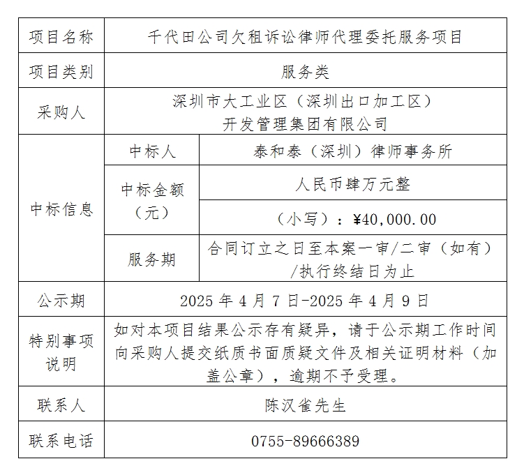 在深圳市阳光采购平台进行公开招标的千代田公司欠租诉讼律师代理委托服务项目已完成定标,现将本项目定标结果进行公示如下: